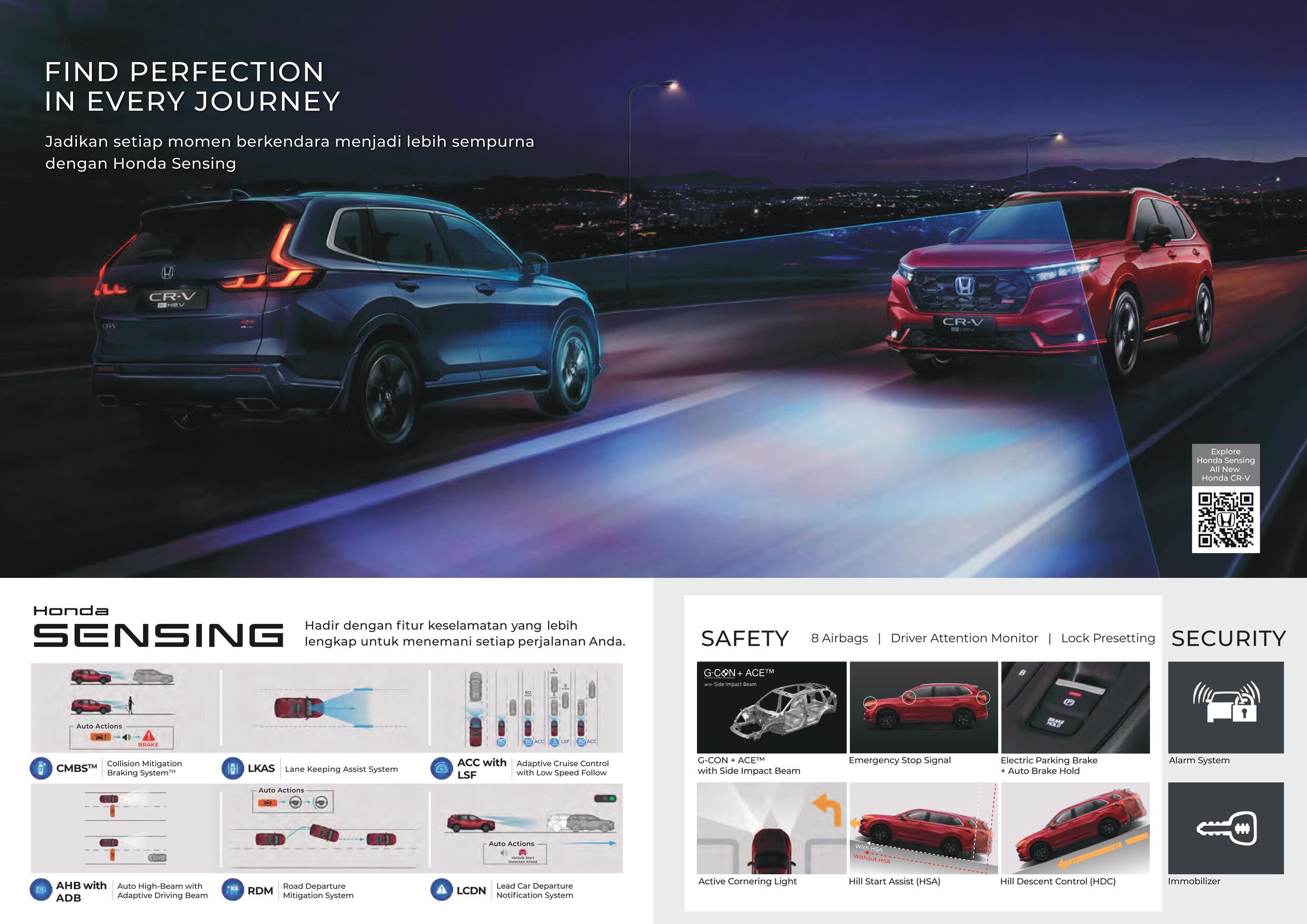 Dilengkapi fitur keselamatan terdepan, termasuk Honda SENSING yang kini hadir lebih lengkap untuk memberikan rasa aman di perjalanan Anda.